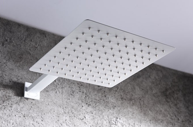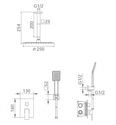 El rociador de acero inoxidable cuadrado de 25×25 cm destaca por su diseño extraplano, acabado mate y sistema antical, que facilita el mantenimiento y asegura una proyección uniforme del agua ducha tras ducha. El tubo de salida de pared y el soporte de salida de pared completan la instalación empotrada con una integración limpia y sin elementos superfluos a la vista.